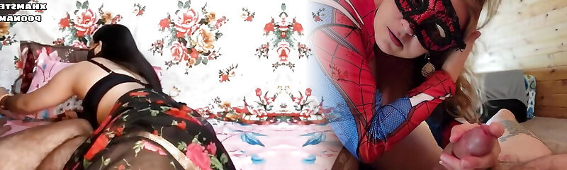 His stunning partner satisfied a huge cock while he sits on the sofa