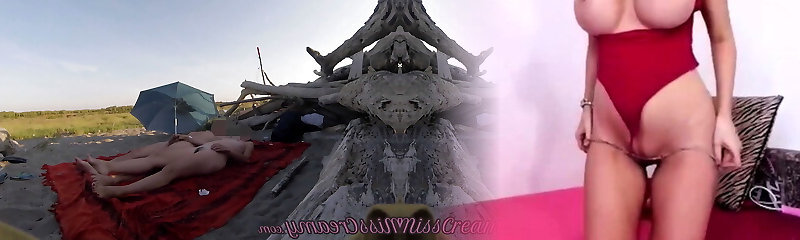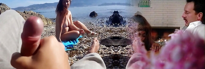 Stranger caught my wife touching and mutual milking my cock and puss on a public bare beach with cumshot -