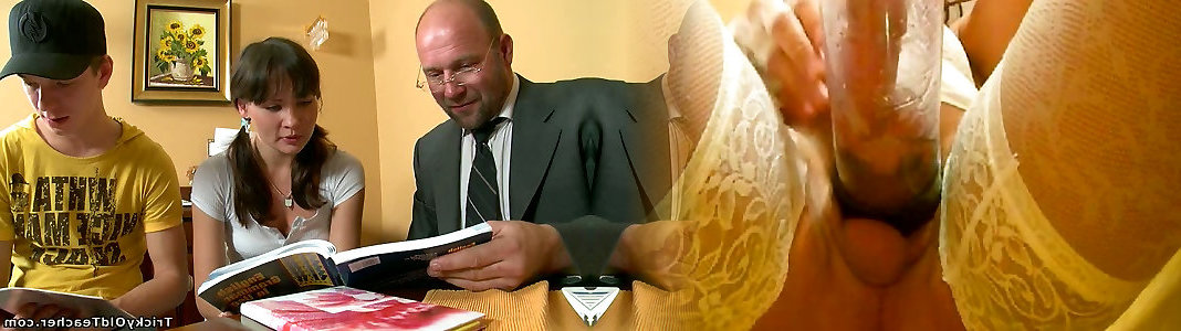 Pretty college woman and her man examine with their mischievous professor